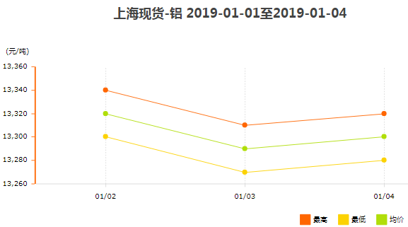 從圖上可以明顯看出2019年1月初的鋁型材價(jià)格在13340元/噸與13280元/噸之間波動(dòng),期間1月2日的現(xiàn)貨上海鋁型材價(jià)格高為13340元/噸,1月3日的鋁型材價(jià)格低價(jià)為13270元/噸。